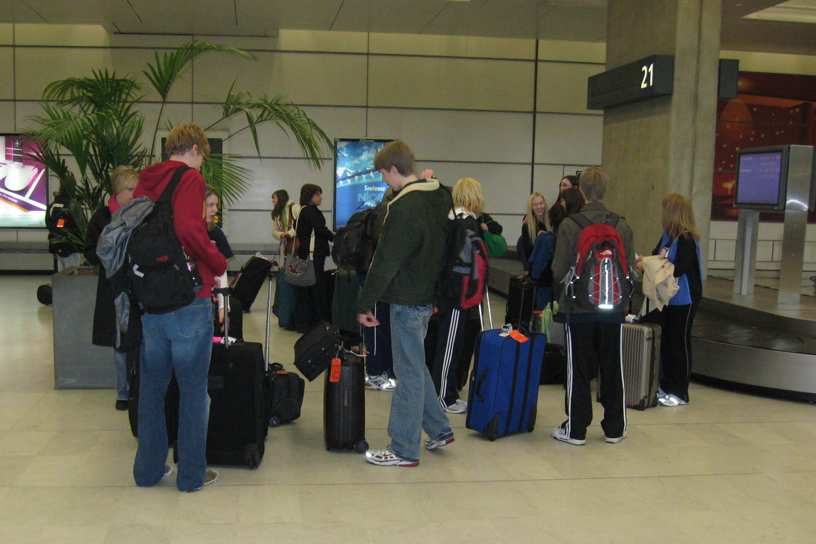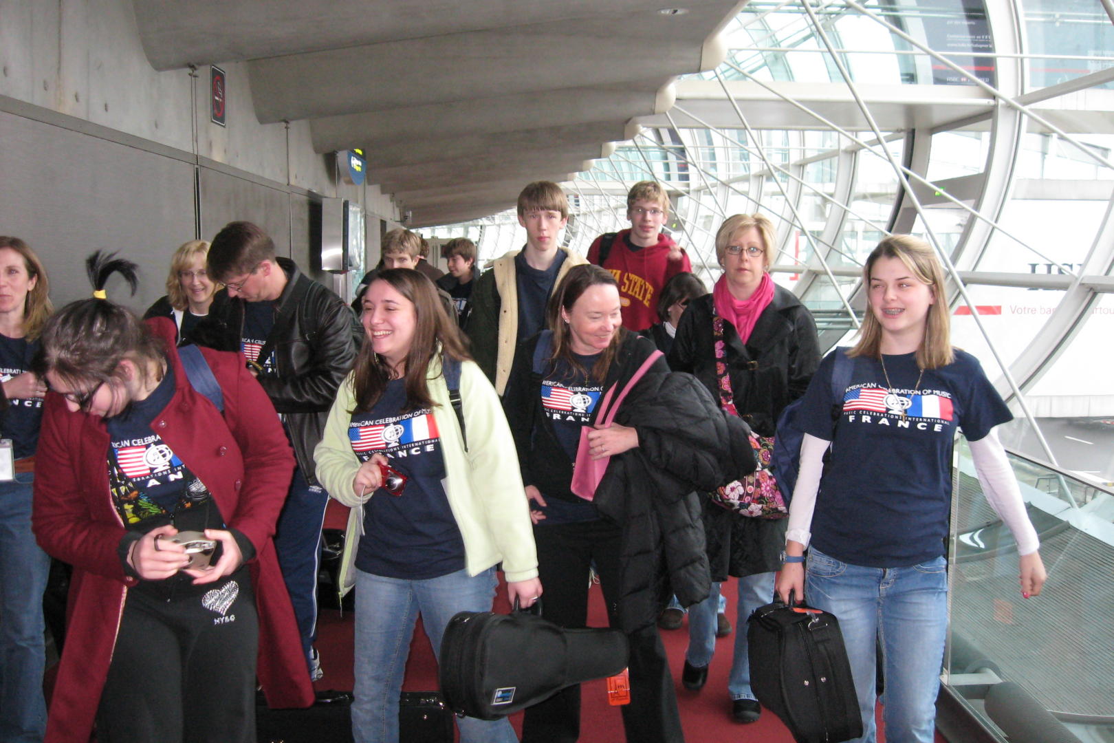 Another airport worker took pictures of my daughter and friends next to a sign that indicated that they were in the Paris airport. He happened to come by me as I was looking at a rack of maps and asked me if I spoke French? I said that I did a little, and he was so happy, he gave me a stack of maps to distribute. We loaded our stuff on our bus then went off to restrooms and whatever while waiting for the other flight. I went with the tour guides to practice my French and help connect them with the other group.