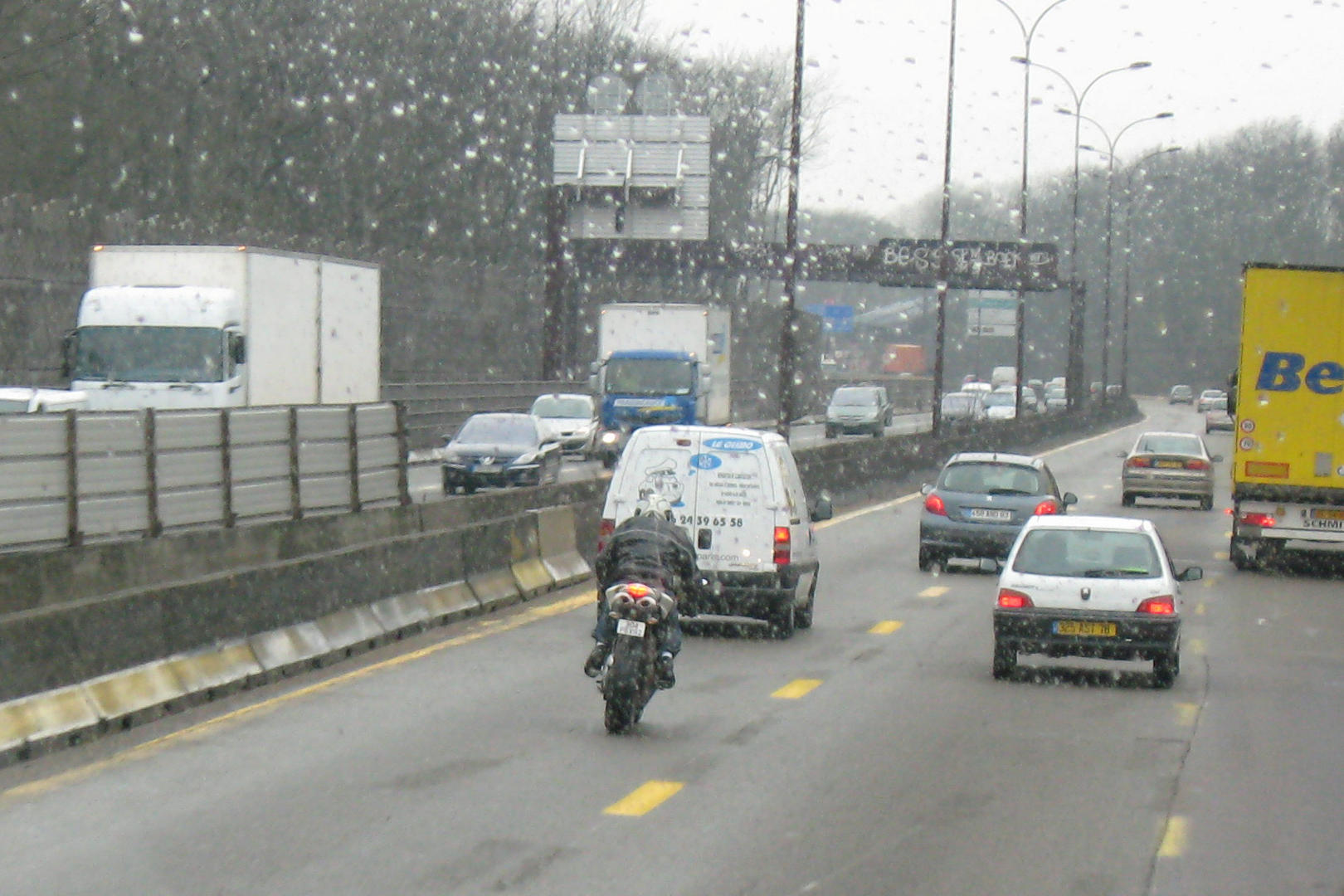 There was some light drizzle on our way out of Paris. The roads were fairly crowded, even though it was late on a Thursday morning. I noticed very early that motorcycles and scooters seemed to have a lane just on the dashed line to the right of the far left lane. The seemed so consistent that it must be a standard practice. The cars in the far left lane would stay to their left, the cars in the next lane over would stay to their right, and two wheelers would zoom through. This would turn out to be more pronounced when we got back to Paris when traffic was tight.