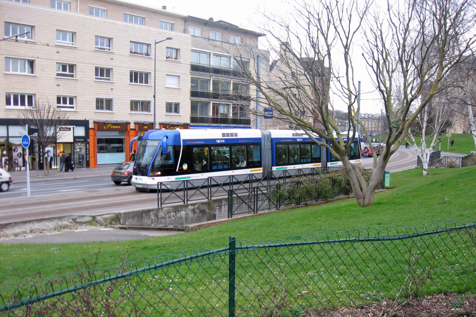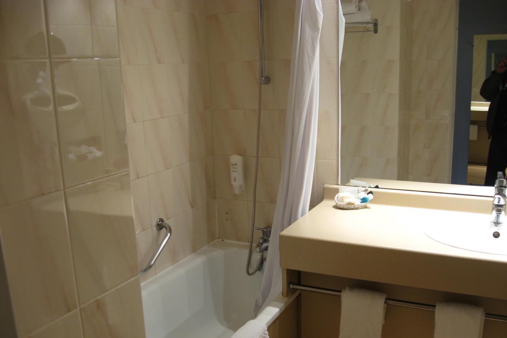 We arrived in Caen at about 2PM local time. We stayed at the Hotel Holiday Inn City Centre. In France, they call the ground floor 0, and 2nd floor 1st and so on. My room was on the “2nd” floor, looking through the flags over the little traffic circle. To my left was the horsetrack. On the right side of my view was the stand of rental bicycles. Apparently one could pop in some coins and take off on one of them, then turn it in at any other similar stand. The room was modest, with two twin sized beds, a bathroom, and a closet big enough to hold maybe two coats, certainly not my suitcase. Under the hairdryer was a combination 110/220V outlet with a label indicating it was for shavers only. I bet an Ipod charger would work as well. My daughter was on the “4th” floor. Her bathroom had only a part shower door. I think the idea is to use the hose, but she could not understand why it did not have a full door. My bath had a shower curtain, though all the rooms in Paris had the small doors.