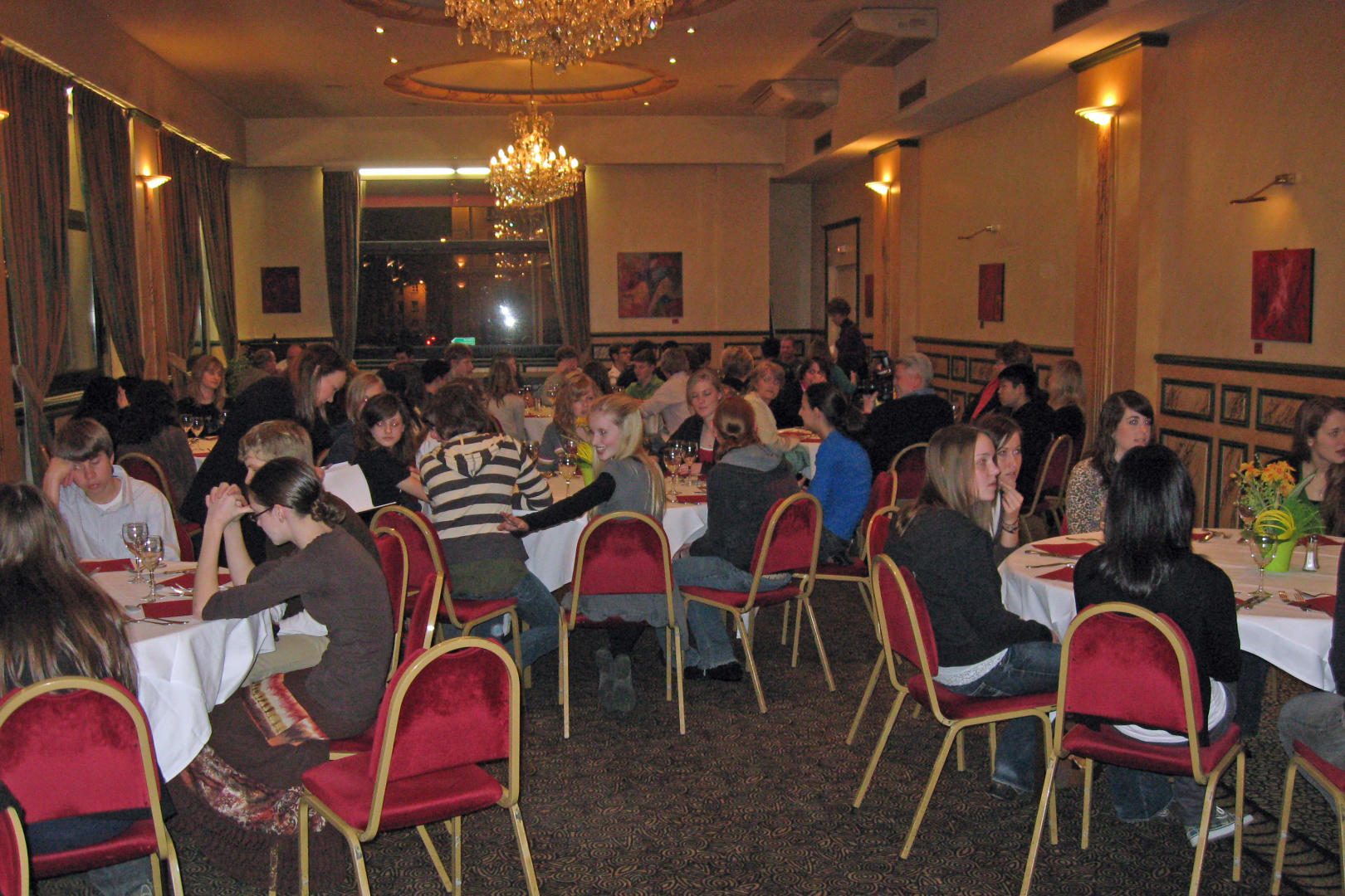 With the jet lag, and all that happened after that, I forgot what we had to eat, only that there were several courses and it was very good. One of the other chaperons thought that the appetizer was dinner.
