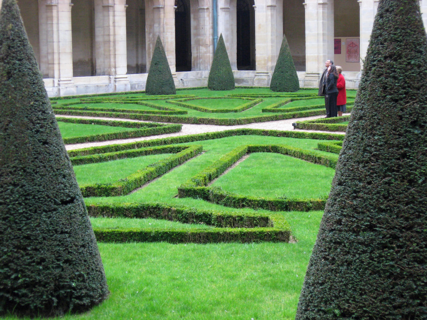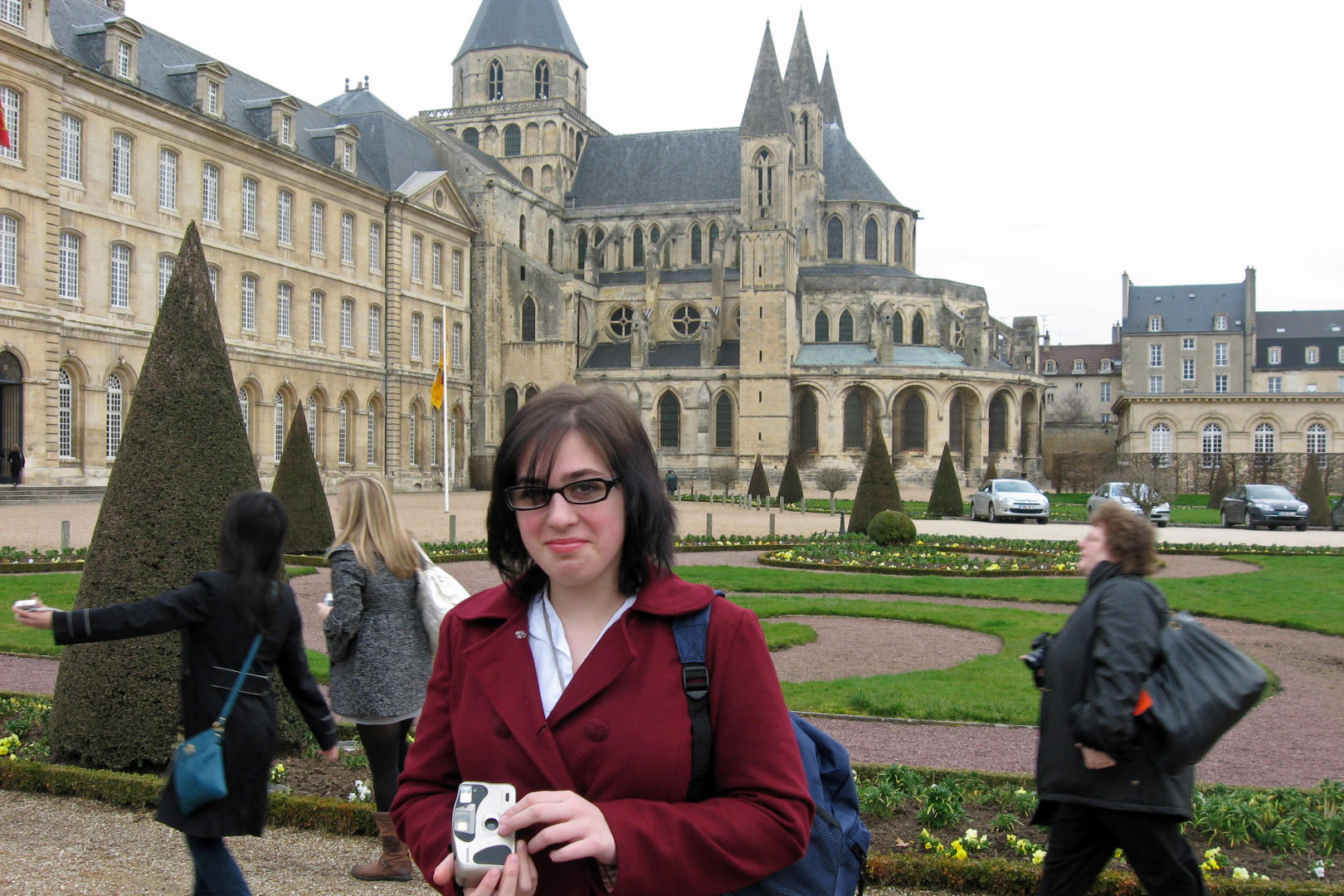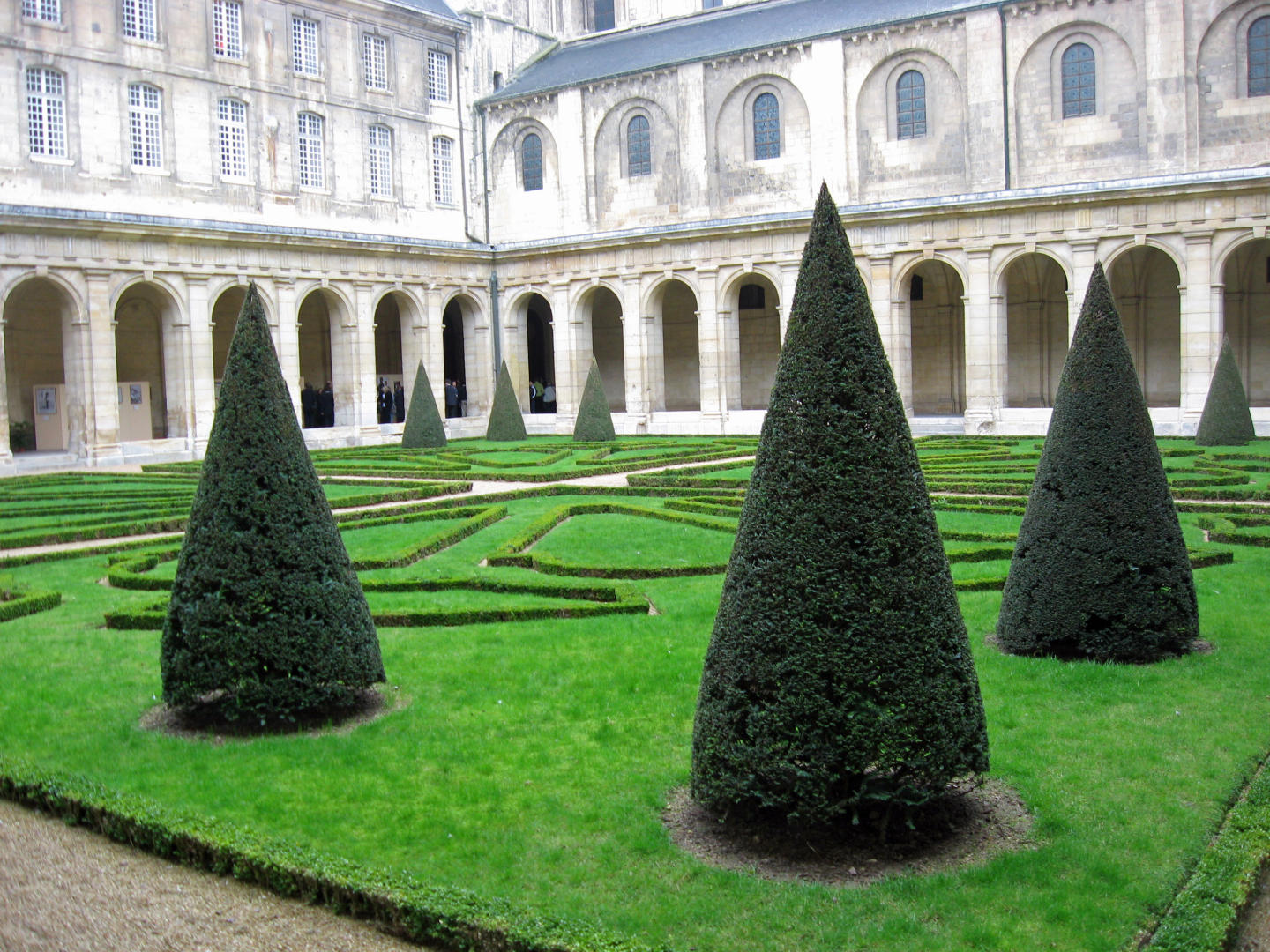 We pulled up at just about 9:00AM and backed onto the grounds of the Abbey. This was the first time I was really struck by the precision and attention to detail in the formal French gardens. They had the perfect conical evergreen trees, the large hedges with perfectly straight sides, the small hedge borders that looked like laser sharp green concrete curbs. There were gardeners changing the flowers for spring. Apparently, tour guides are licensed in France, so we picked up our guide for Caen at the Abbey. Each of the three groups went to tour the Abbey in a different area to take the tour in a different order.
