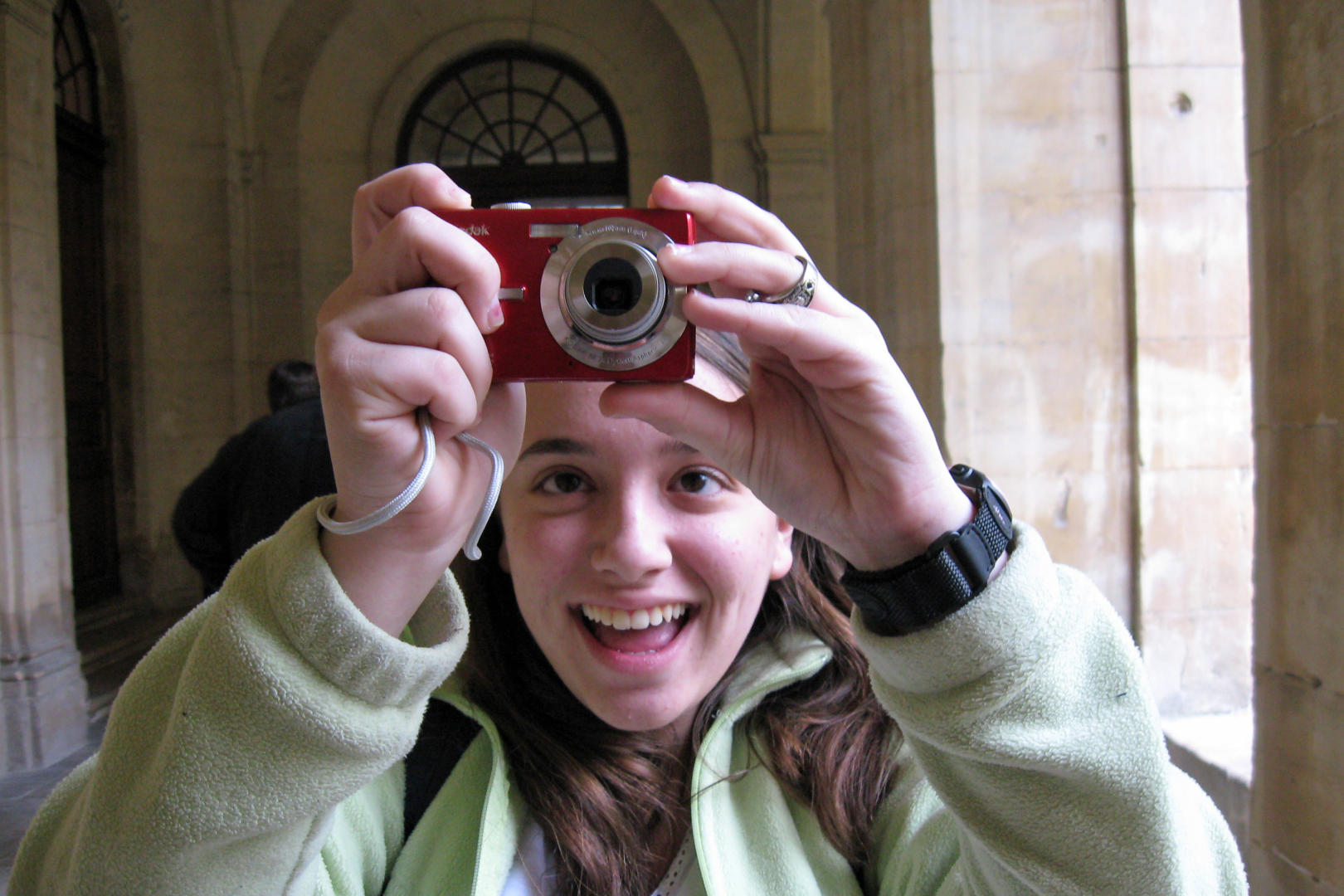 The performers did some set up, then everyone waited while there was some kind of automatic bell ceremony. After that the orchestra and choir each performed a couple pieces. It sounded wonderful, and some of the other visitors stopped to listen, but the performers complained of not being able to hear themselves. I am looking forward to listening to the recordings. Our principal showed one of her multiple talents as a substitute tripod for one of the cameras.