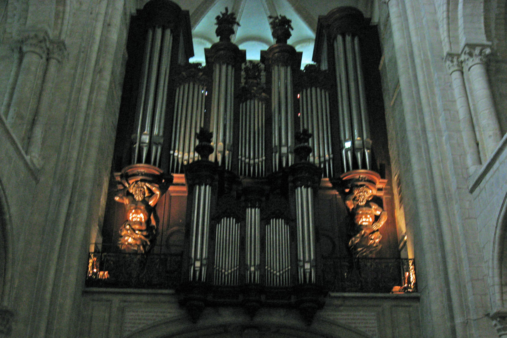 We took a scenic route along the coast to our next stop, a concert at the church of St. Aubin-Sur-Mer (St. Aubin by the sea). We had been impressed by the bus drivers already, but here was where they really showed their stuff. The scale of roads in France is smaller than in the U.S. Our Mercedes tour buses would barely fit in between the lanes, though they were about as wide as a large SUV. They held just under 50 people each. There were three mirrors on each side, and the driver sat very near the front windshield, a bit in front of the front wheels. It took me a while to figure out that the secret to their maneuverability was the long overhang, short wheelbases, and small turning radius. In tight turns the bus would overhang the sidewalk. In many of the small towns, the houses on the sides of the streets had high walls, and looked like they had been built to allow two horses or horsecarts to pass each other. In quite a few places, cars would have to squeeze against the wall and wait for us to pass them. I have no idea how the drivers knew when to wait and when to go. Many of the passengers took to just not looking too closely. By the way, these buses had manual transmissions and 6 side mirrors