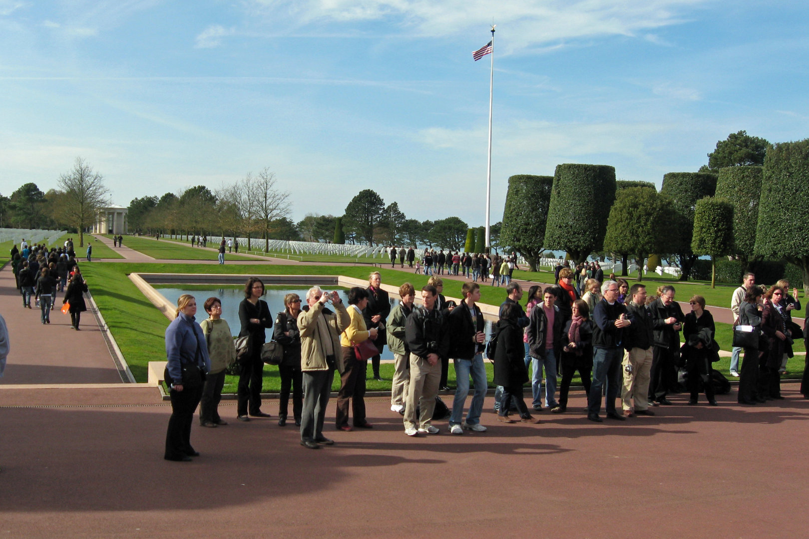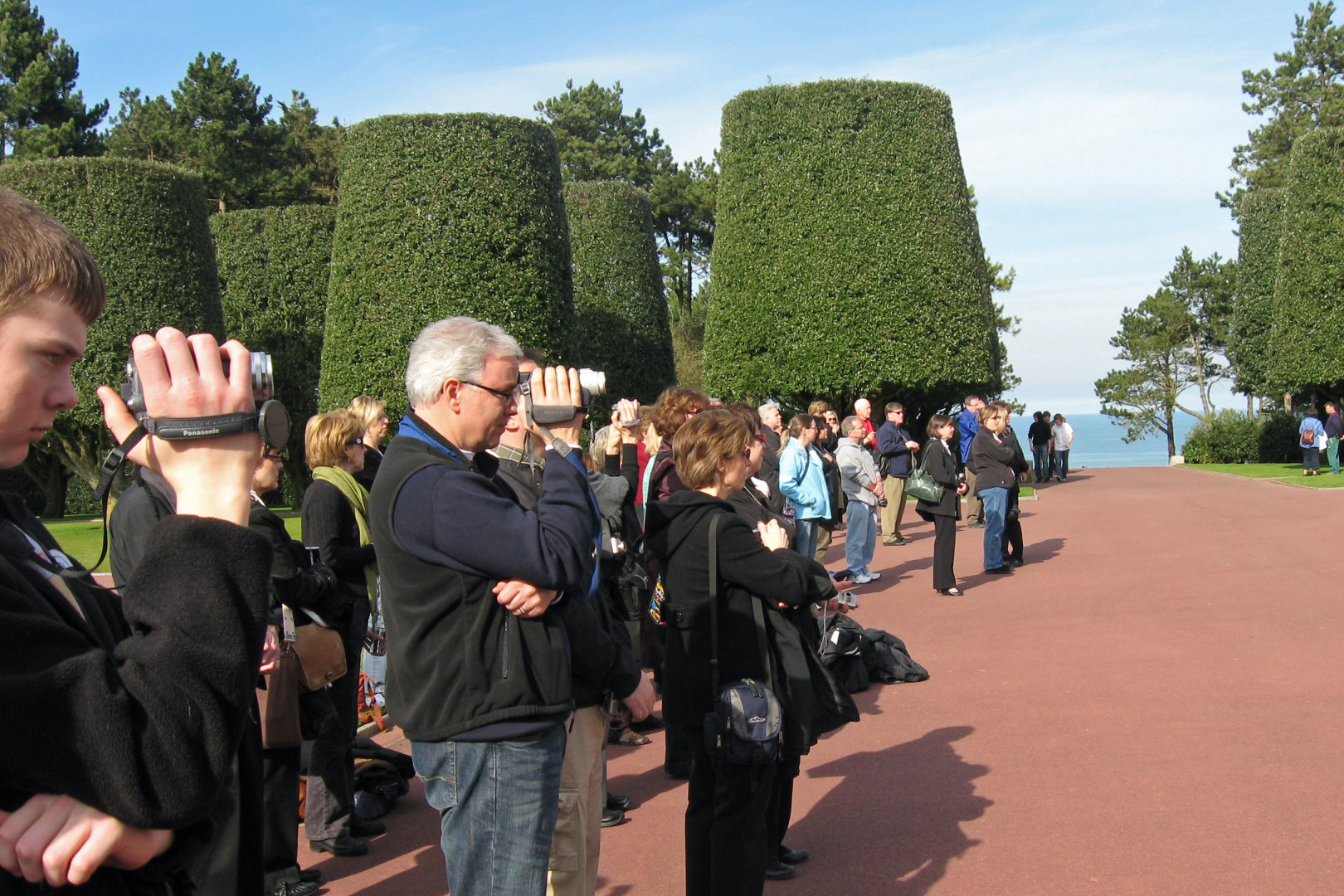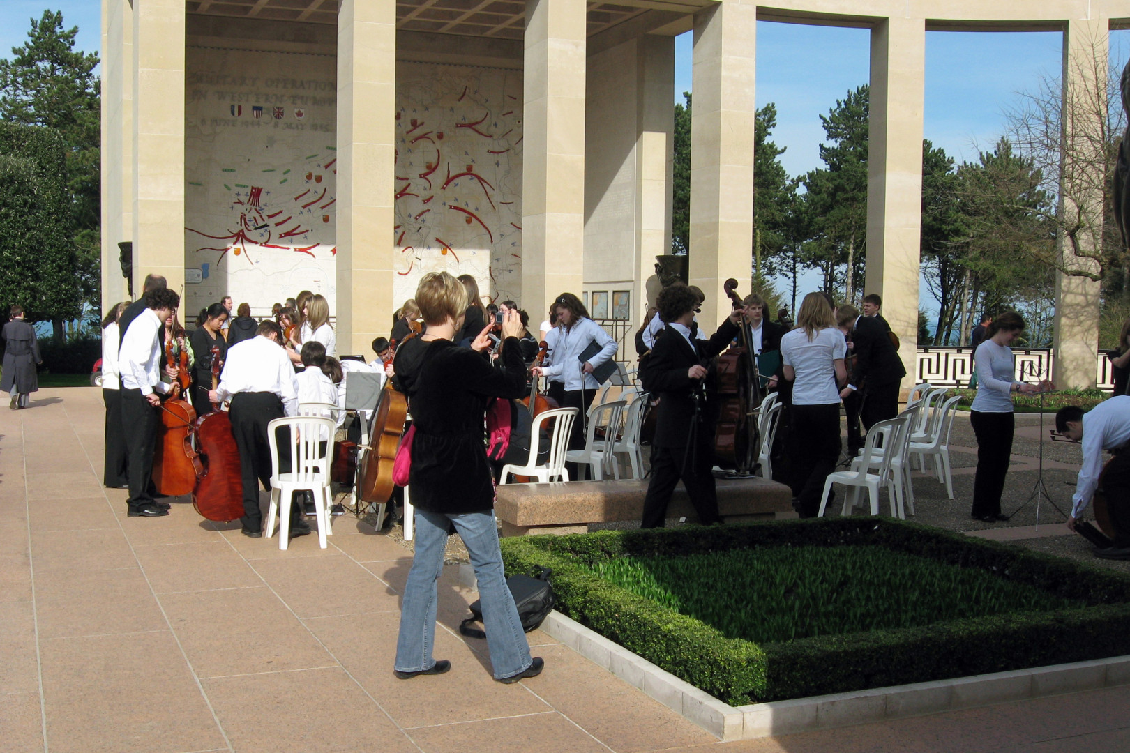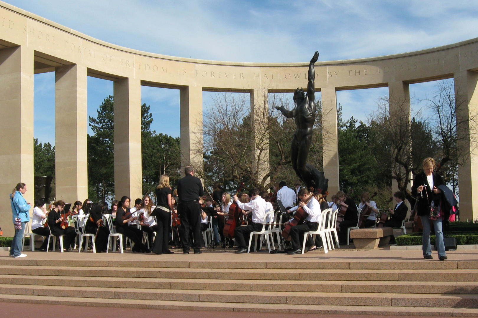 We arrived at the American Cemetery in Coleville at about 2:45PM. We walked down a path for almost 5 minutes to get to where the concert would be. At first, the trees looked ordinary, then a somewhat organized garden, then we came to these trees that looked like nothing I had ever seen. There were precision cut in a cylindrical, trapezoid shape, like giant green gumdrops on sticks. They lined the path perpendicular to the stage and on to the beach. The stage consisted of a half circle of rectangular columns, with a large statue in the middle. To each side of the stage were large maps showing how the battles of D-Day, June 6 1944 progressed. The stage overlooked a reflecting pond, and beyond were white crosses as far as one could see.