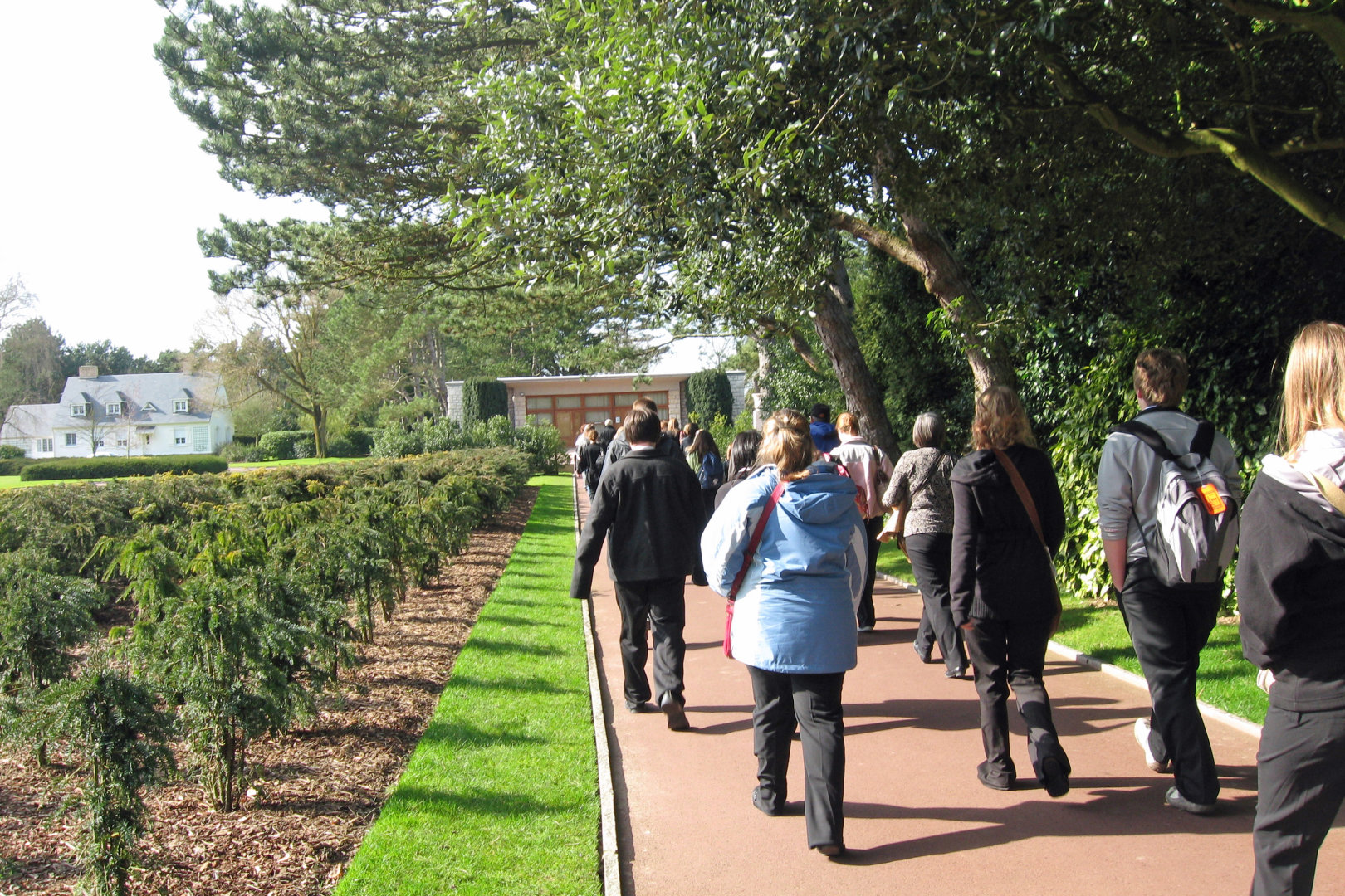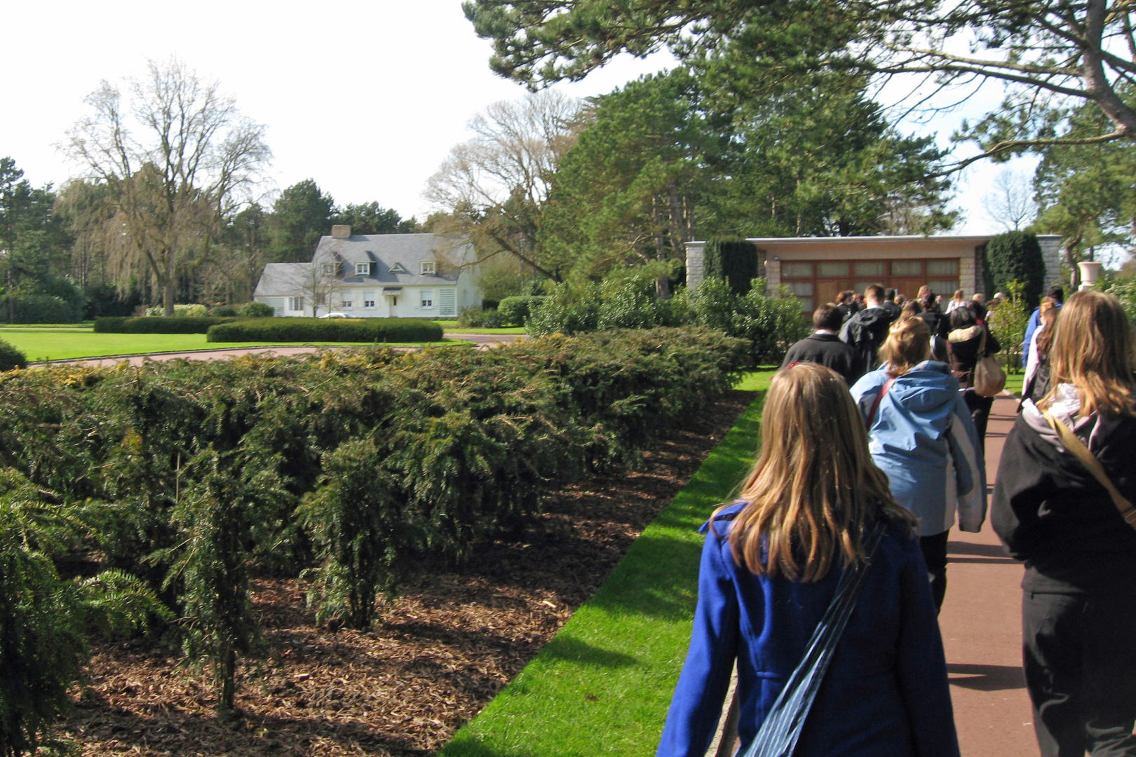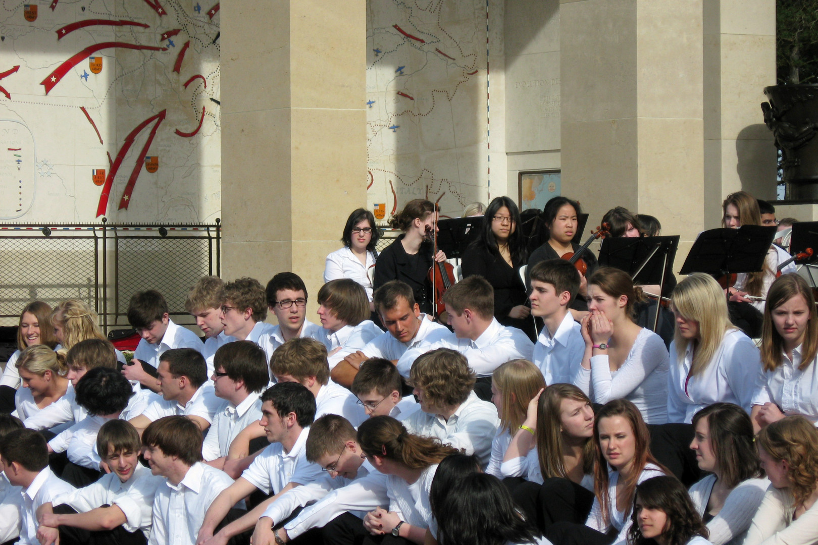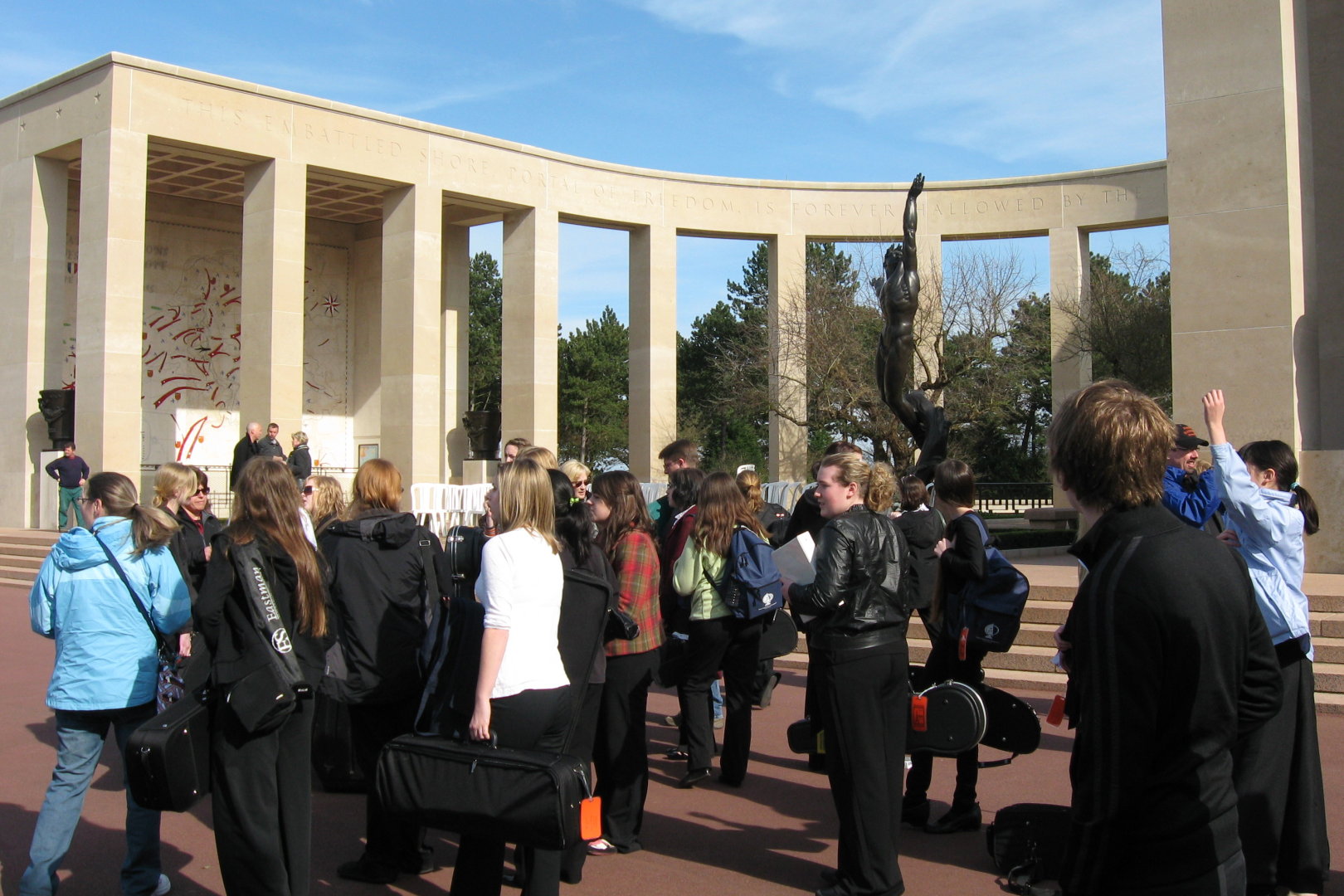 We arrived at the American Cemetery in Coleville at about 2:45PM. We walked down a path for almost 5 minutes to get to where the concert would be. At first, the trees looked ordinary, then a somewhat organized garden, then we came to these trees that looked like nothing I had ever seen. There were precision cut in a cylindrical, trapezoid shape, like giant green gumdrops on sticks. They lined the path perpendicular to the stage and on to the beach. The stage consisted of a half circle of rectangular columns, with a large statue in the middle. To each side of the stage were large maps showing how the battles of D-Day, June 6 1944 progressed. The stage overlooked a reflecting pond, and beyond were white crosses as far as one could see.