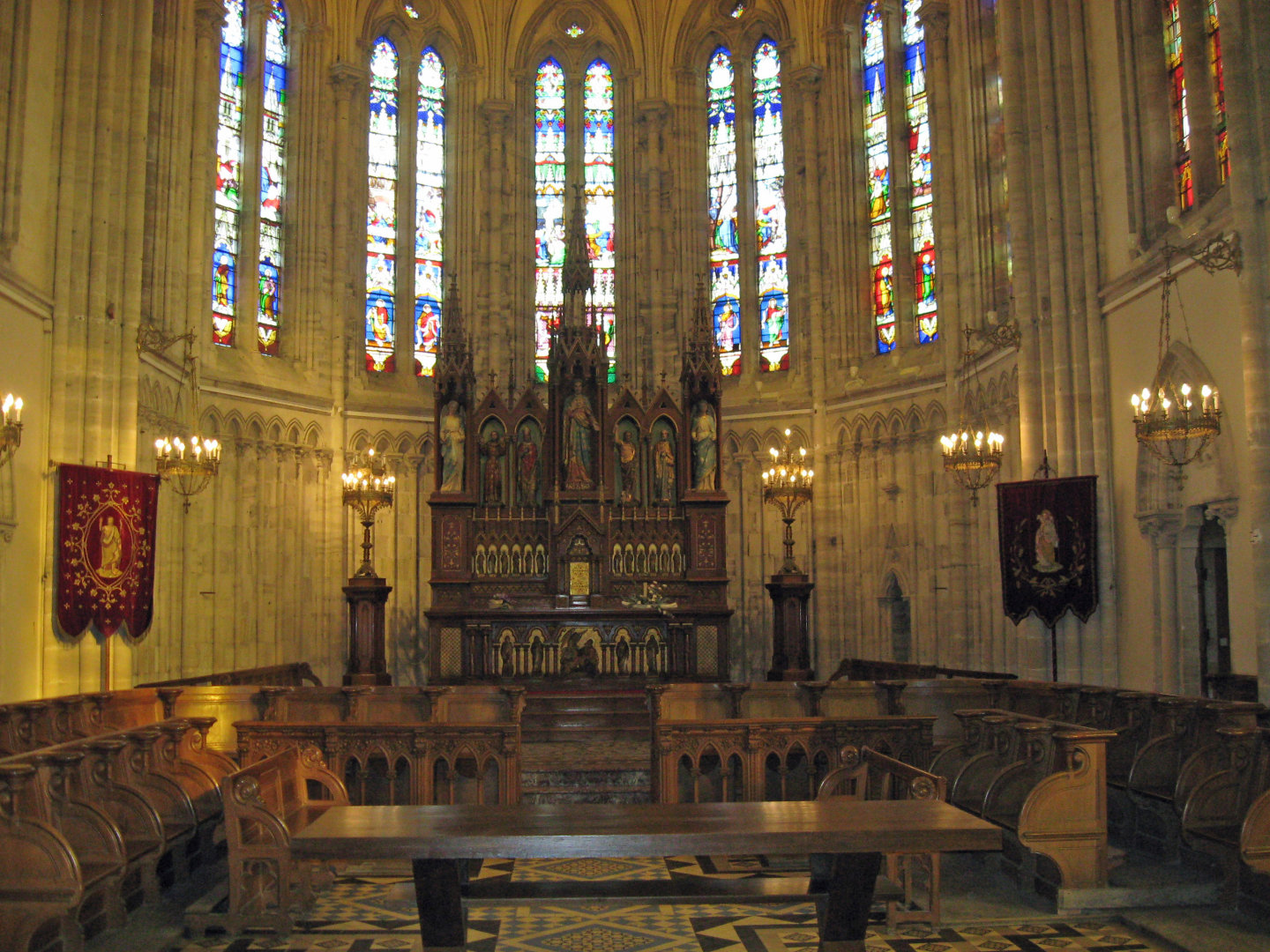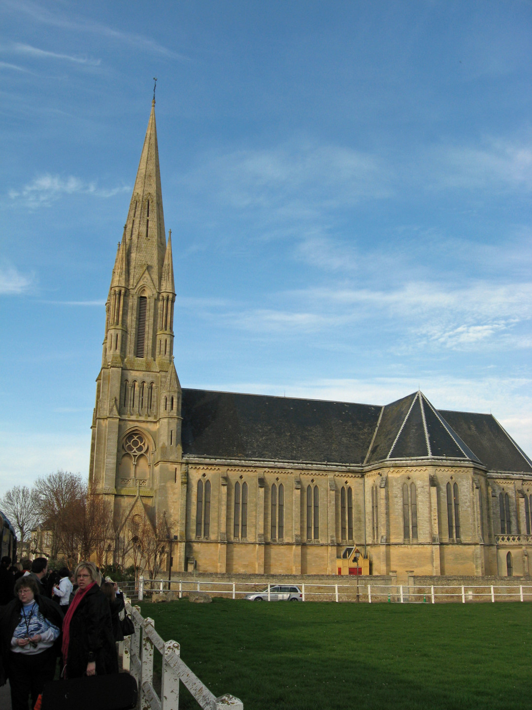We reshuffled the bus assignments to distribute some orchestra and choir students for each bus for the time in France. The buses loaded up at about 8:30AM, and we went to the other hotel to pick up the choir folks. We passed the canal with lots of boats docked near the other hotel. When everyone was loaded, we came back past our hotel and the horsetrack on our way to the Men's Abbey, founded by William the Conqueror.