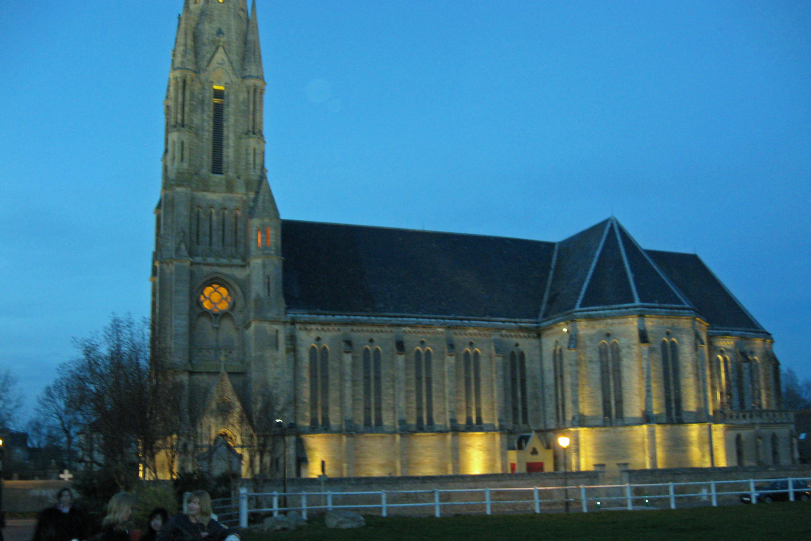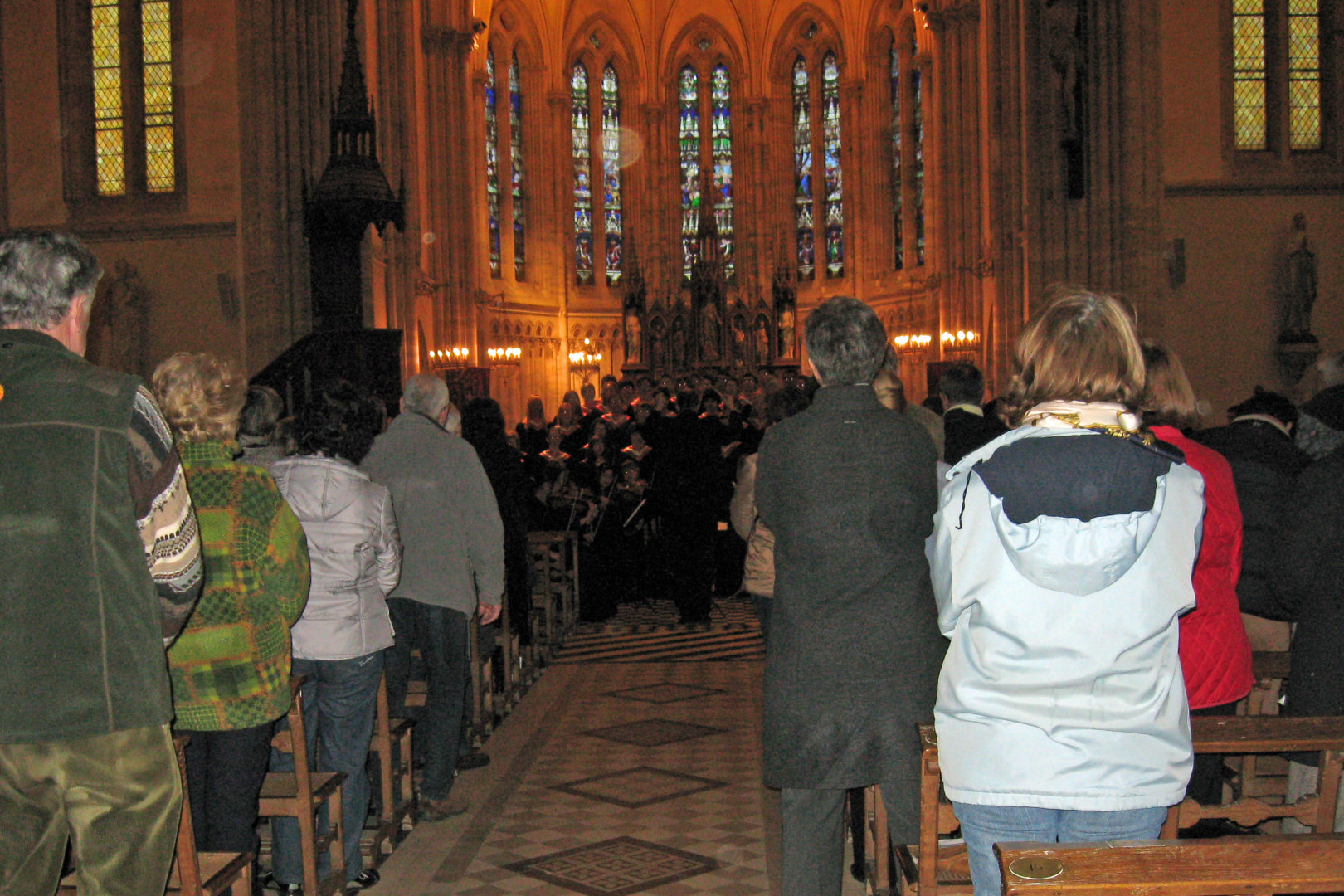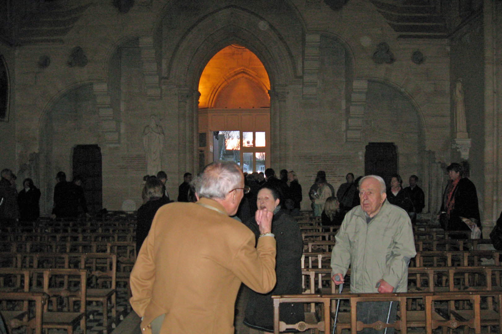It was a little chilly inside the church. All the audience was wearing jackets. Some of the orchestra members later complained of stiff fingers. However, the response was a bit warmer. There was still light from the stained glass windows, and a glow from lights near the altar. The place was about 75% full, even with the 2 euro minimum cover charge. They even gave a standing ovation for the French and American national anthems. Afterwards, the people from the church asked to be able to provide some refreshments, so we got some juice and cookies in a smaller but warmer room next door. The sunlight was nearly gone when we loaded up the buses again, with just a medium blue light behind the church and a glow from the outside lights. We took a more direct route back to Caen.