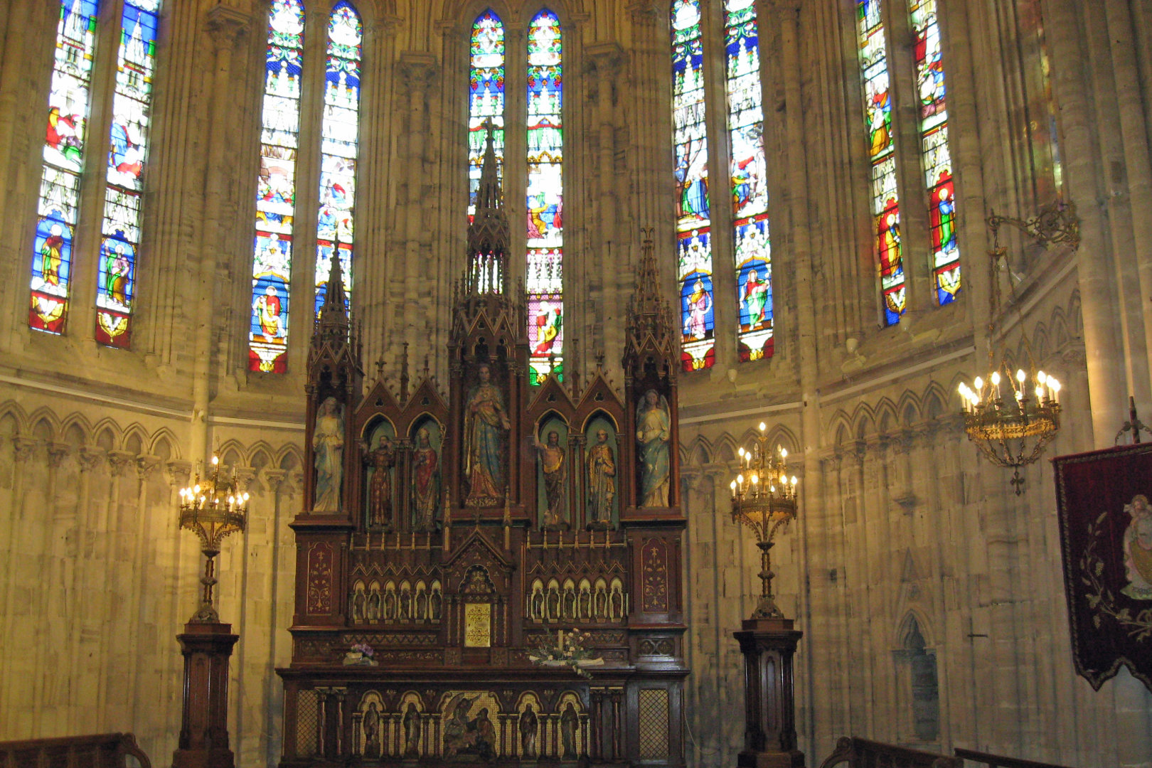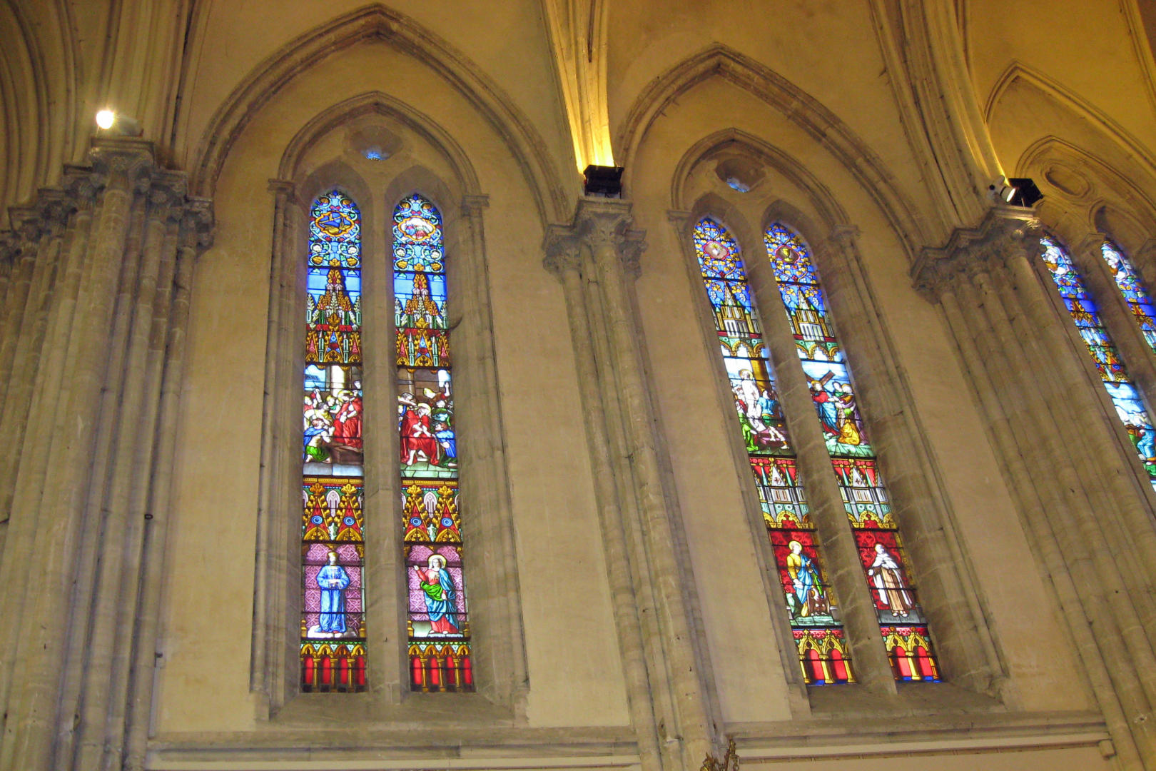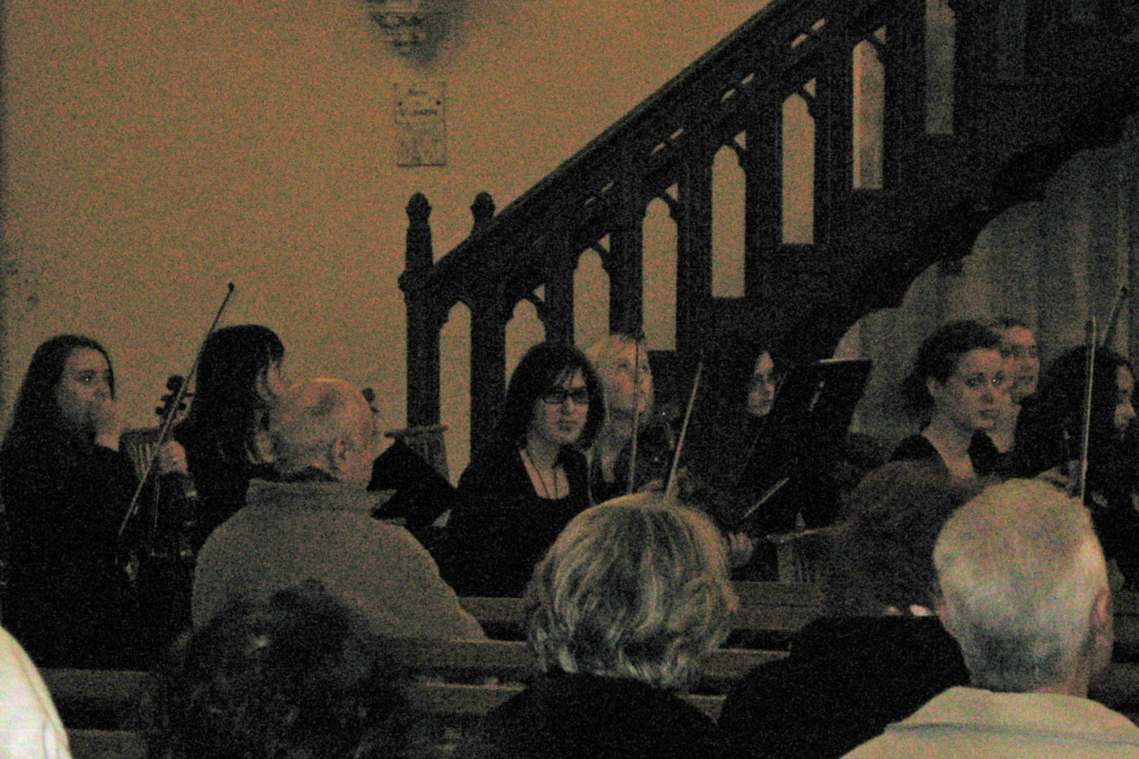 It was a little chilly inside the church. All the audience was wearing jackets. Some of the orchestra members later complained of stiff fingers. However, the response was a bit warmer. There was still light from the stained glass windows, and a glow from lights near the altar. The place was about 75% full, even with the 2 euro minimum cover charge. They even gave a standing ovation for the French and American national anthems. Afterwards, the people from the church asked to be able to provide some refreshments, so we got some juice and cookies in a smaller but warmer room next door. The sunlight was nearly gone when we loaded up the buses again, with just a medium blue light behind the church and a glow from the outside lights. We took a more direct route back to Caen.