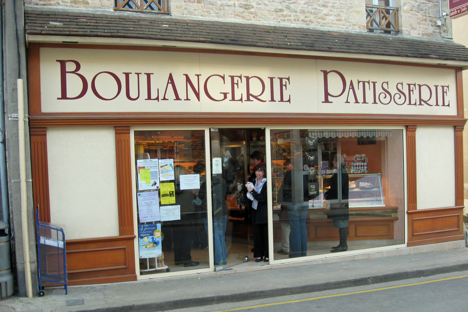 We reached our destination at about 5 PM. The venue was a beautiful old church in a small village in Normandy called Saint Aubin-sur-Mer. There was an hour before the concert, so after taking some pictures, a group of the parents and chaperons took a walk to find a cafe for a snack. The cafe was only just opening, so the group I was with walked a little farther, and came upon a wonderful bakery. We could not all fit in there at one time. They had the usual pastries and bread, and also chocolates. I helped translate the signs for some of the others. Someone noticed that there was a publicity poster on the window for our concert so I took a picture of it and (in French) informed the proprietor that we were with the group mentioned on the poster to which she said “tres bien” (very good). I bought what turned out to be a very delicious almond croissant. I ate about half and saved it for my daughter for later. .