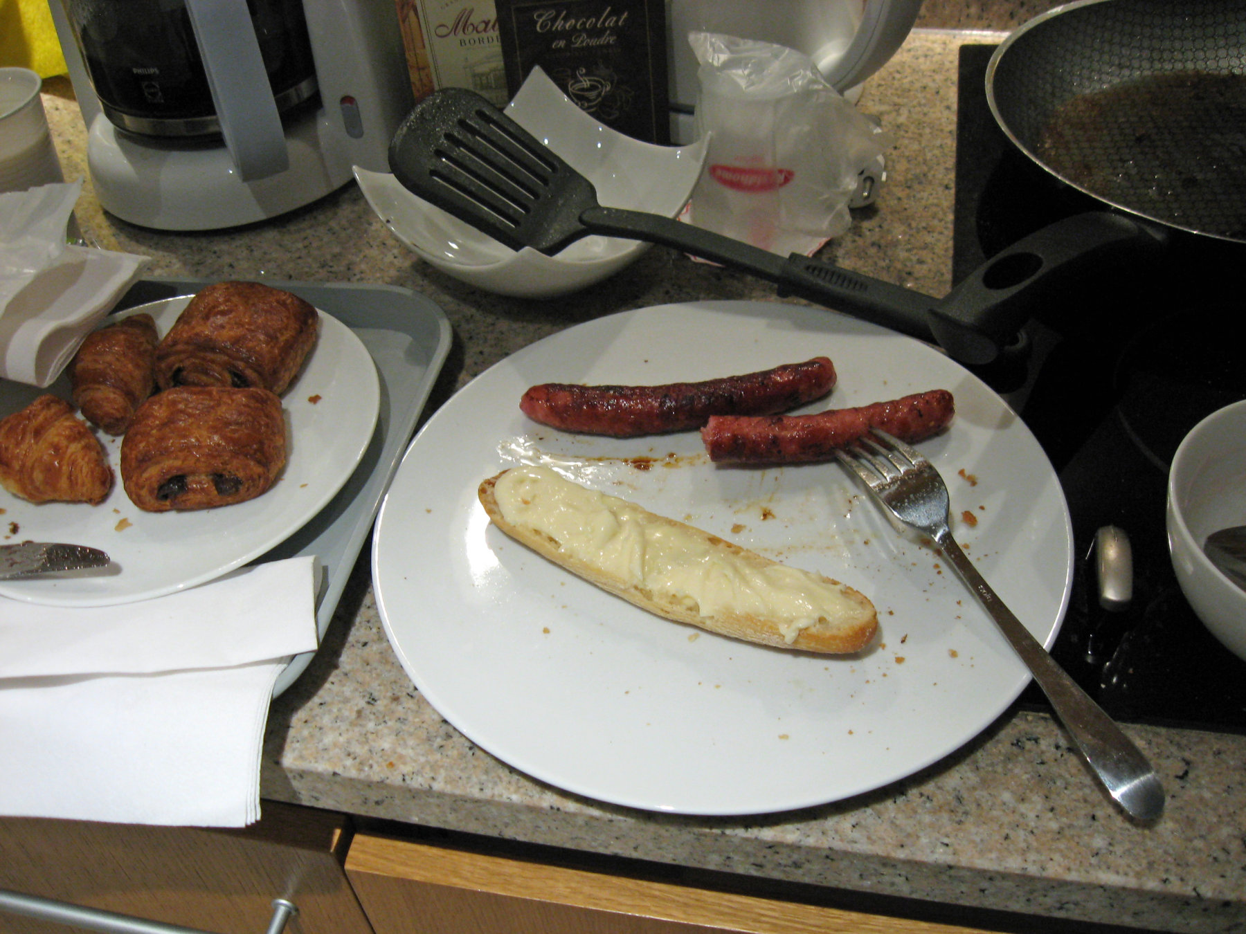 I finally got to have some protein for breakfast! It took me a few minutes to figure out that there was a timer on getting electricity to the stove and microwave. I had to turn on the timer, then the stove worked. We had a frypan so I cooked up the sausages. They had some different kind of taste than I have had, they must use different spices. They were good anyway. I also put as much Camembert on my bread as would fit, since we would not be able to eat all of it before we went back to Iowa. The cheese was the consistency of cold nacho dip. Left alone it would settle. It smelled... strong, but tasted good.