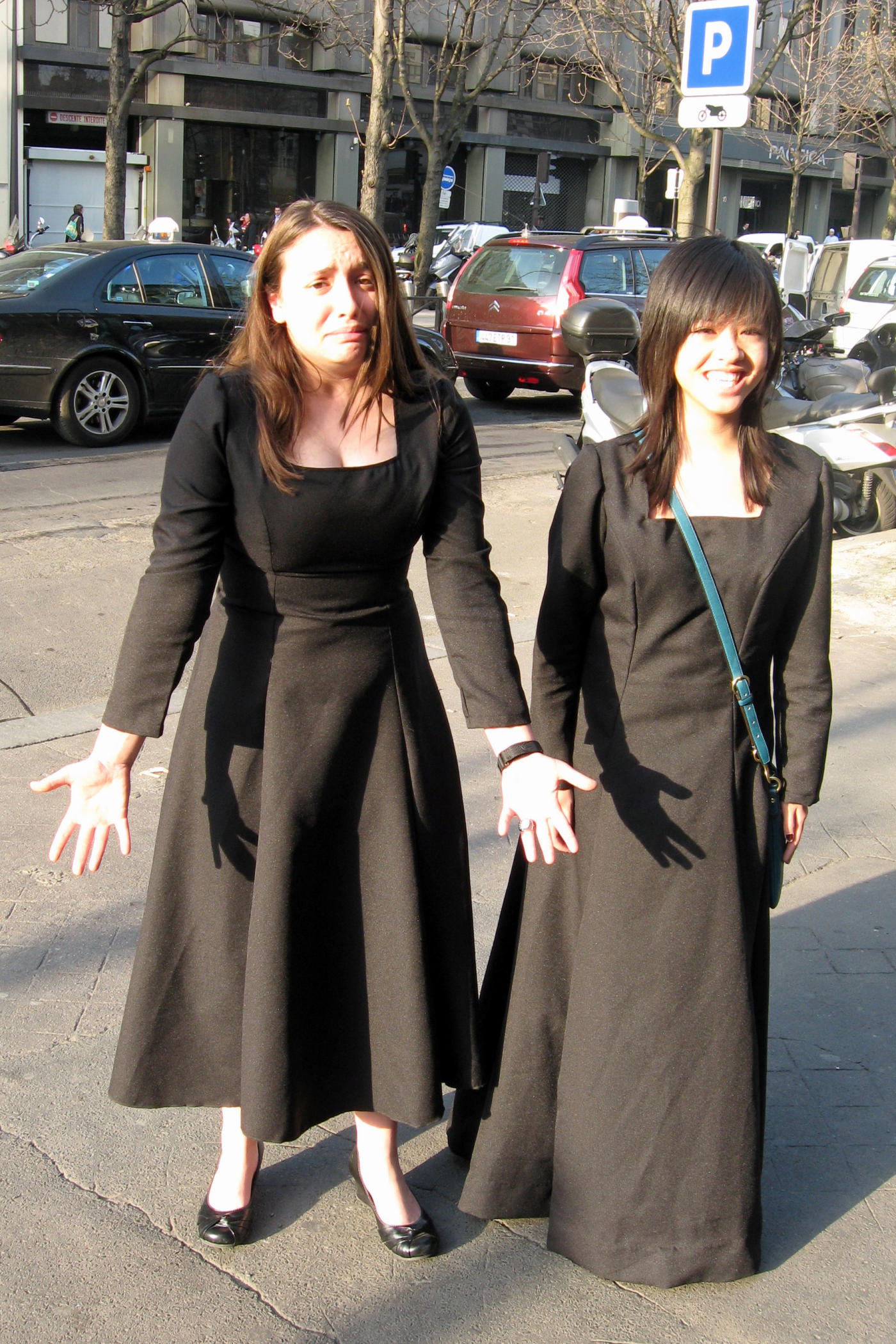 We had a concert scheduled for after dinner, so the boys changed into their tuxes in the bus on the way to the restaurant. This mostly consisted of putting on their shirts, ties, and jackets. The girls waited until all the boys were off where we parked a couple blocks from the restaurant. At the concert at La Madeleine, one of the violinists was wearing a dress that was way too tight for her. When we saw how short it was for her we said that whoever switched would be the one with the dress dragging the ground. Just then, her friend walked up, holding up her skirt. She had even helped zip her friend up, wondering who would have taken the wrong skirt! It was too late to go back to the bus, so they went to the restroom in the restaurant. It was one of those where one has to pay.