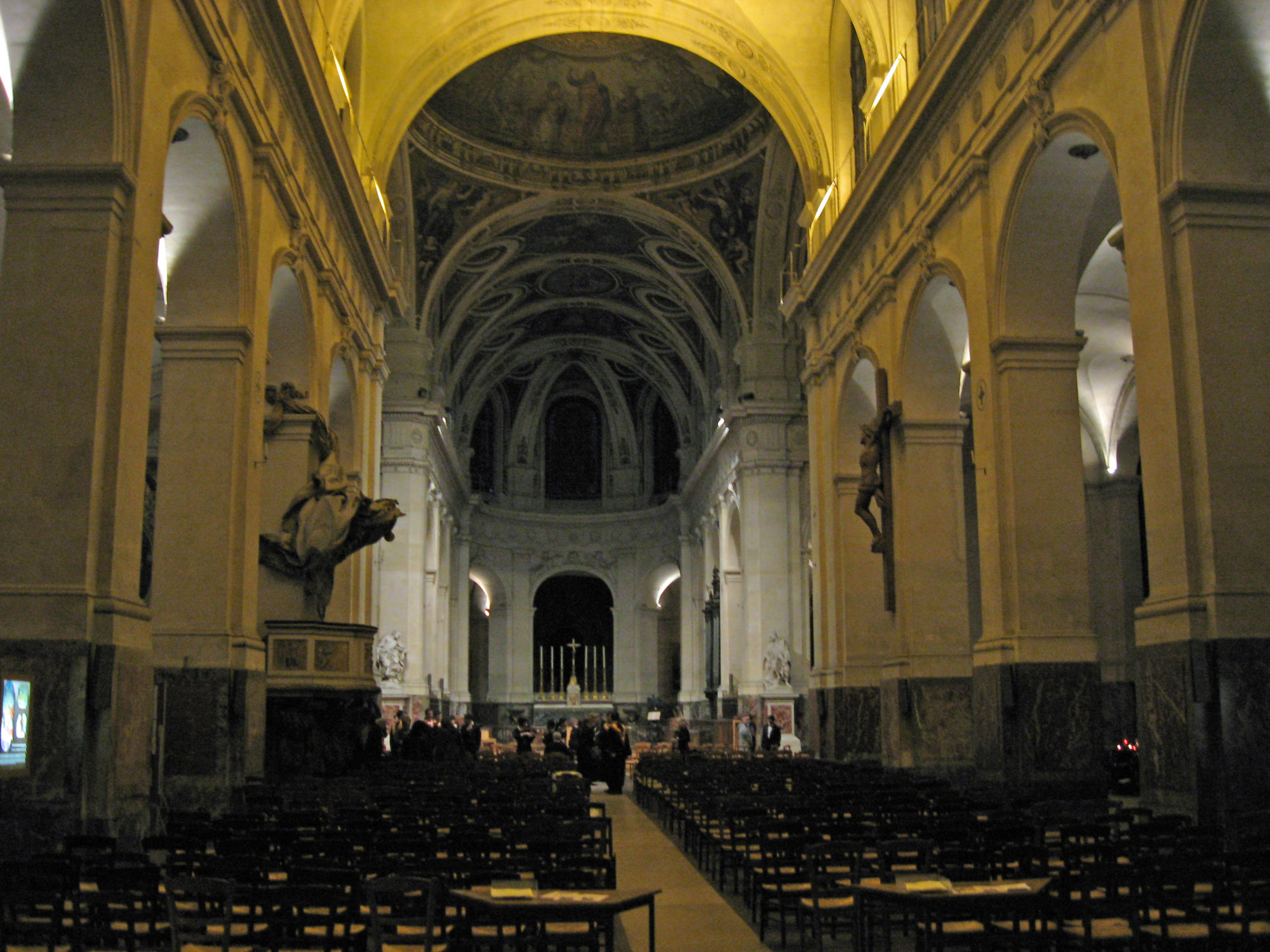 The last concert was to be at 8:30PM at Saint Roch, a mid 19th century church squeezed in a little North of the Louvre. We arrived at dusk. It had an unusual statue of some figure floating over the pulpit on the left side, directly across from the crucifix. I only took a few pictures. I could sense mixtures of sadness at the thought that we would be leaving the next day, and relief that we would be leaving the next day. Most of us were a little exhausted. To be honest, the performances sounded as good to my rock music damaged ears as any of the others. The orchestra director made the unusual move of letting the choir director conduct the combined performance. It moved her and caused some consternation in the orchestra but I thought it a good move for the last performance. I did notice that he went back in the audience and enjoyed the performance from a different perspective, just watching and listening to the result of everyone's months of hard work.