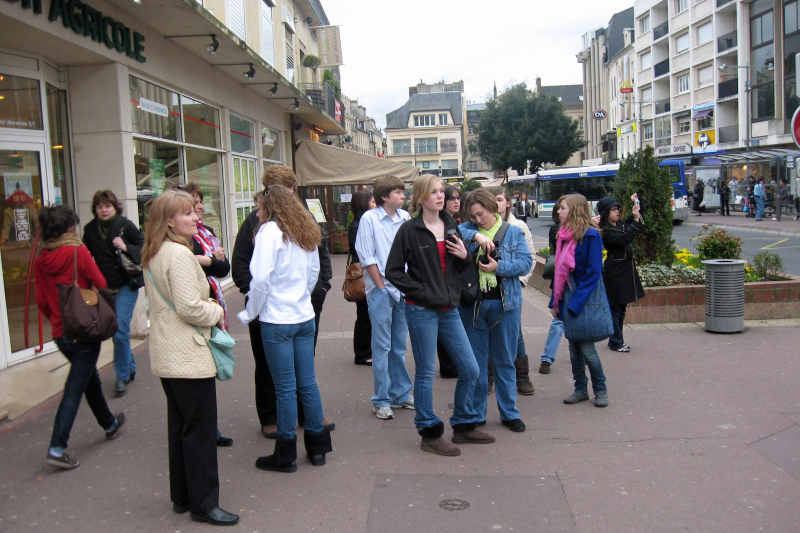 Another airport worker took pictures of my daughter and friends next to a sign that indicated that they were in the Paris airport. He happened to come by me as I was looking at a rack of maps and asked me if I spoke French? I said that I did a little, and he was so happy, he gave me a stack of maps to distribute. We loaded our stuff on our bus then went off to restrooms and whatever while waiting for the other flight. I went with the tour guides to practice my French and help connect them with the other group.