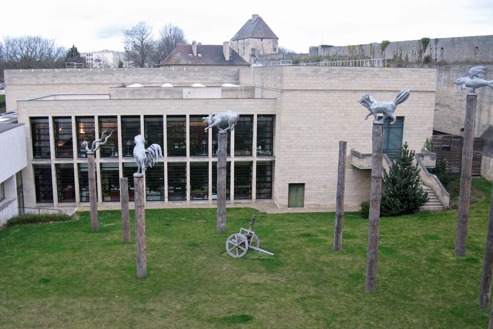 After some rest, a few of us set out on a little walking tour of Caen. We had a map and some vague directions about where to go. I felt more confident than some of the others about reading the map, so helped decide directions to make our way over to the Chateau. This part of Caen had wide sidewalks and narrow streets. I saw some more of the trees with all the branches cut off. This time they were much bigger and seemed to make more sense. In other areas, the narrow shoots were trimmed in to giant hedge shape. A couple days later our guide would tell us what kind of tree they were and that France was famous for them, but I did not get to write down what they were, just marvel at their alien nature.