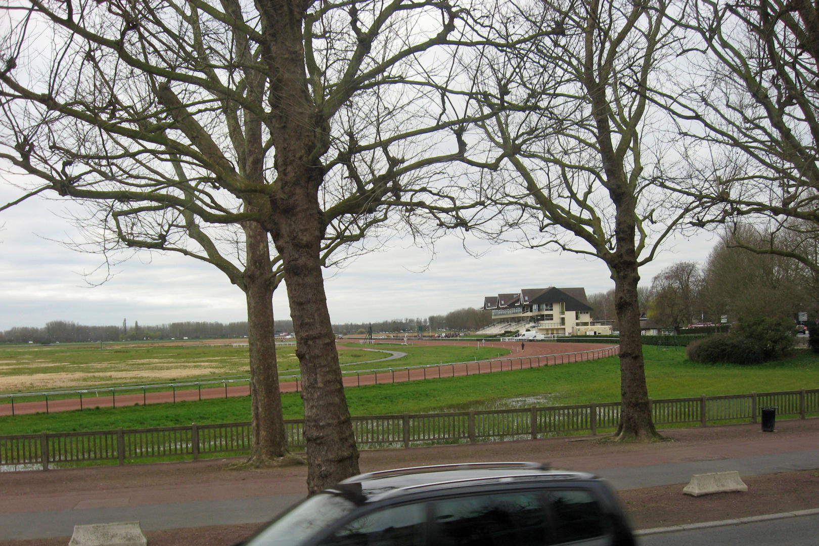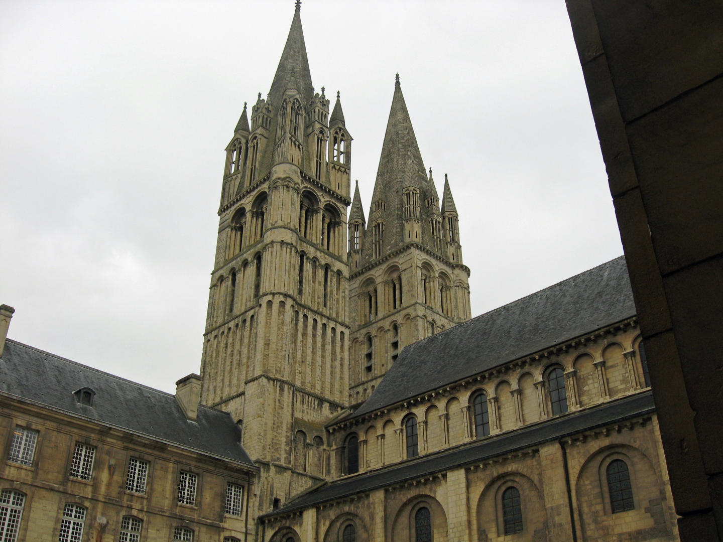 We reshuffled the bus assignments to distribute some orchestra and choir students for each bus for the time in France. The buses loaded up at about 8:30AM, and we went to the other hotel to pick up the choir folks. We passed the canal with lots of boats docked near the other hotel. When everyone was loaded, we came back past our hotel and the horsetrack on our way to the Men's Abbey, founded by William the Conqueror.