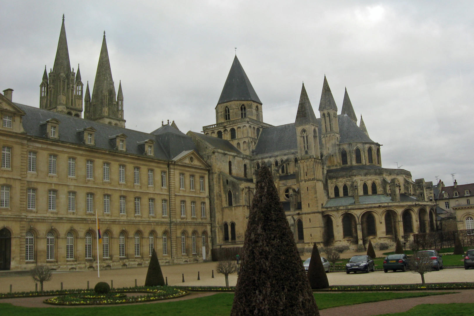 We pulled up at just about 9:00AM and backed onto the grounds of the Abbey. This was the first time I was really struck by the precision and attention to detail in the formal French gardens. They had the perfect conical evergreen trees, the large hedges with perfectly straight sides, the small hedge borders that looked like laser sharp green concrete curbs. There were gardeners changing the flowers for spring. Apparently, tour guides are licensed in France, so we picked up our guide for Caen at the Abbey. Each of the three groups went to tour the Abbey in a different area to take the tour in a different order.