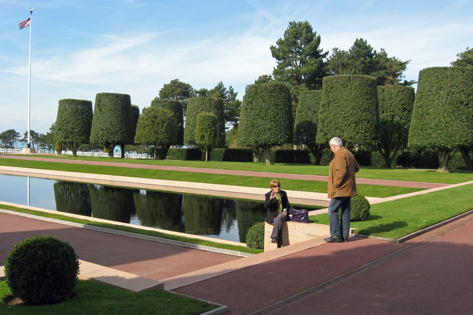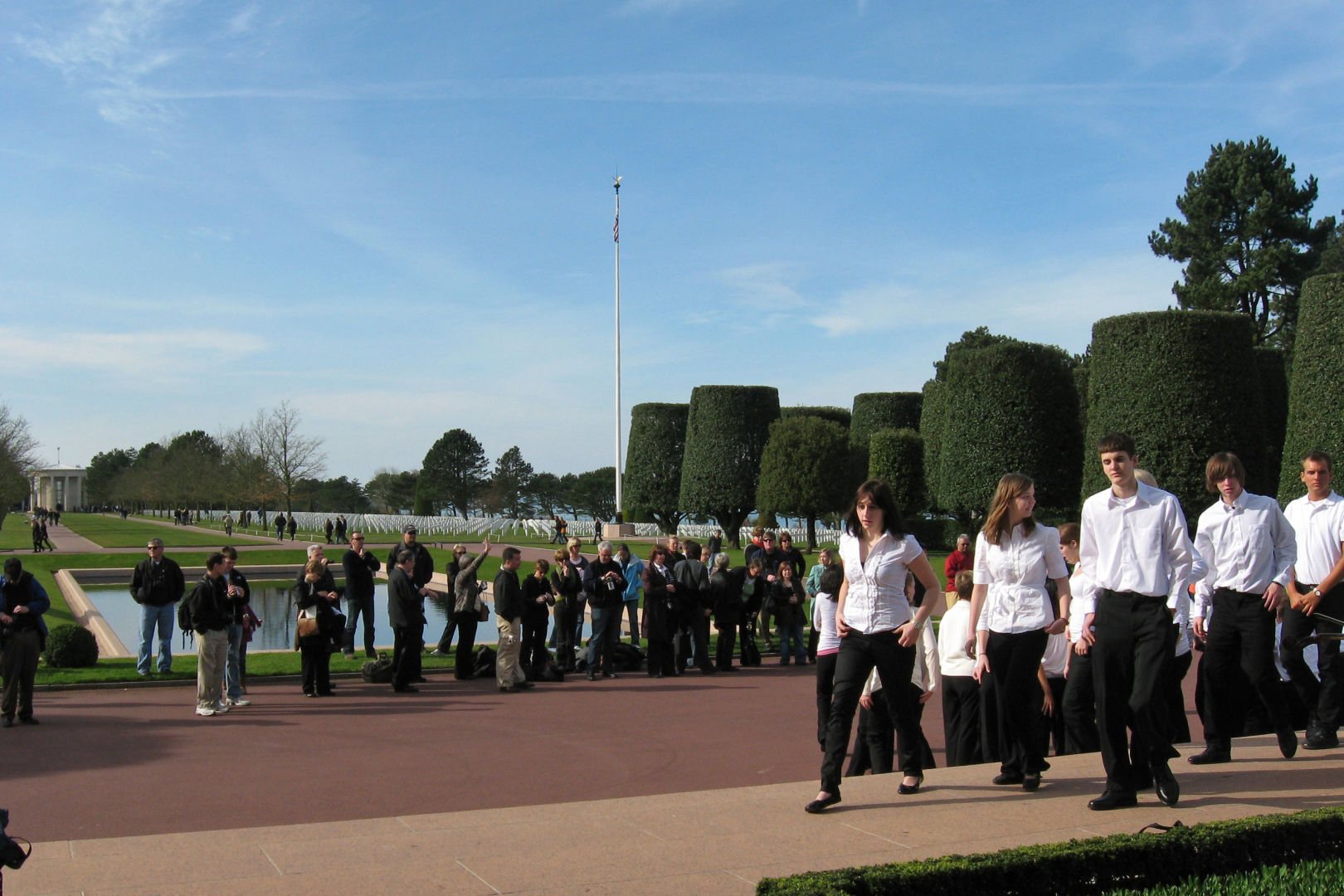 We arrived at the American Cemetery in Coleville at about 2:45PM. We walked down a path for almost 5 minutes to get to where the concert would be. At first, the trees looked ordinary, then a somewhat organized garden, then we came to these trees that looked like nothing I had ever seen. There were precision cut in a cylindrical, trapezoid shape, like giant green gumdrops on sticks. They lined the path perpendicular to the stage and on to the beach. The stage consisted of a half circle of rectangular columns, with a large statue in the middle. To each side of the stage were large maps showing how the battles of D-Day, June 6 1944 progressed. The stage overlooked a reflecting pond, and beyond were white crosses as far as one could see.