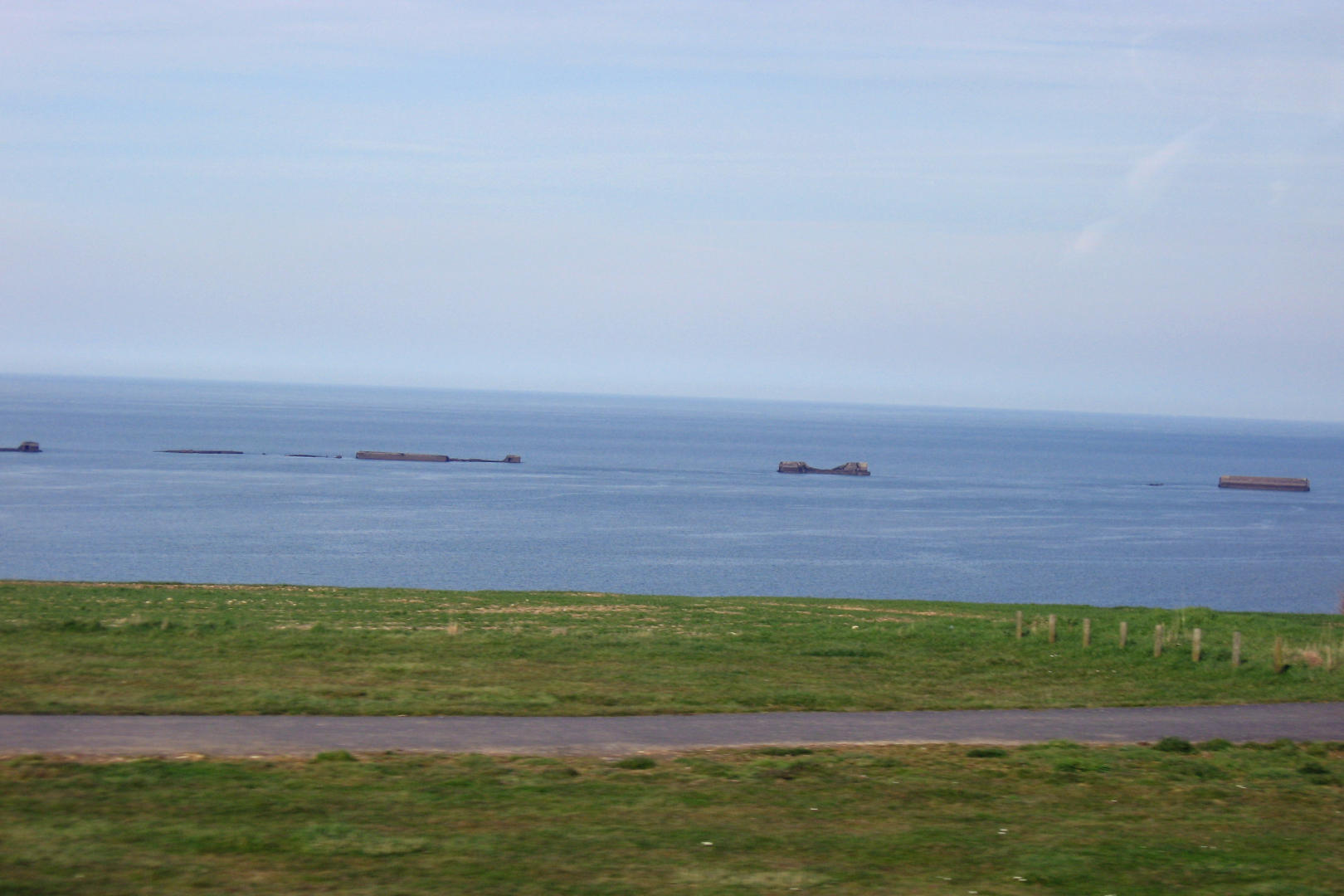 The sun had come out, and the countryside was beautiful. One of the girls had come to the bus to change without getting a picture of the beach, so our guide talked to the driver about going slow at an area that was close enough to take a picture from the bus. I got pictures of some artificial harbor built during the allied invasion in 1944.