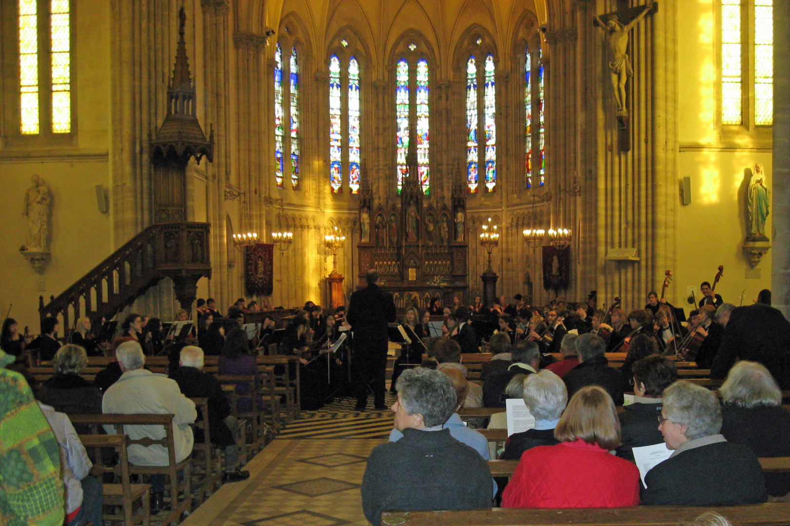 It was a little chilly inside the church. All the audience was wearing jackets. Some of the orchestra members later complained of stiff fingers. However, the response was a bit warmer. There was still light from the stained glass windows, and a glow from lights near the altar. The place was about 75% full, even with the 2 euro minimum cover charge. They even gave a standing ovation for the French and American national anthems. Afterwards, the people from the church asked to be able to provide some refreshments, so we got some juice and cookies in a smaller but warmer room next door. The sunlight was nearly gone when we loaded up the buses again, with just a medium blue light behind the church and a glow from the outside lights. We took a more direct route back to Caen.