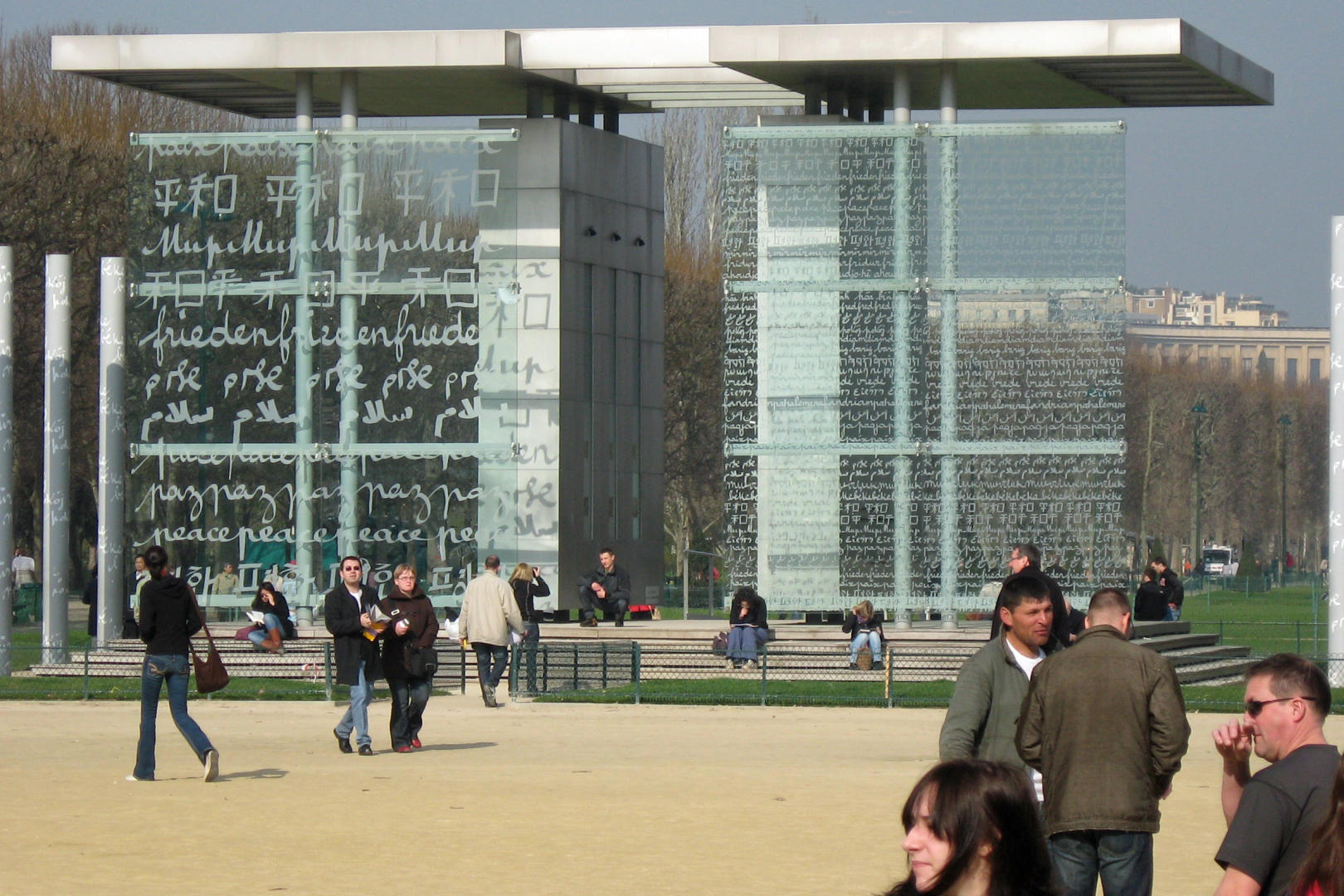 We stopped at the Northwest side of the Eiffel Tower for a photo op. The souvenir vendors were very aggressive, so although I saw a guy setting up to sell some beautiful art, I told him I liked it but not now. I had the idea of stopping there later on free time. We went over to the other side, near a monument for Peace. There were no aggressive vendors yet, and there was a guy with some paintings and drawings. My daughter had expressed a desire to do more shopping than to come back, so I thought harder about buying a painting while I had the chance. I asked the vendor if he was the artist, and he said no, it was someone from Sacre Coeur (Sacred Heart). I did find one I liked, and he knocked 20% of the price he was asking. It is about 8x10 inch and a scan is attached. We got our obligatory photos with us and the Eiffel Tower.